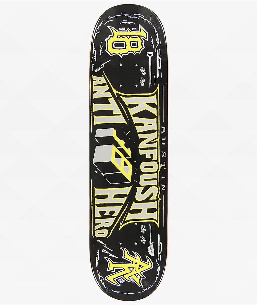 Honoring team rider Austin Kanfoush with a signature pro model in his favorite 8.25" width, the Customs skateboard deck measures 32" in length with a special 14.38" wheelbase. Boasting shiny silver foil detailing on the bottom ply, Austin's name is highlighted above bold Anti-Hero branding to look like signage for an old business.