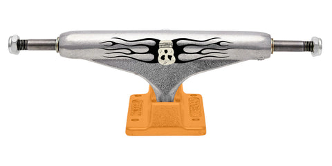 Independent Truck Company Elijah Berle Skull Pro Stage 11 trucks featuring pad printed art by Elijah, pad printed BERLE on yoke, with polished silver hanger, flat orange baseplate, orange cushions, and silver hardware.