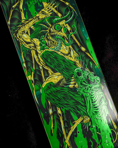 J Worth’s classic Skinner graphic is reignited with mesmerizing green foil on his 8.6” VX Skullburn Pro 1-Off. Lord Worthington’s indisputable go-to whip just got leveled up and is ready for some serious abuse.