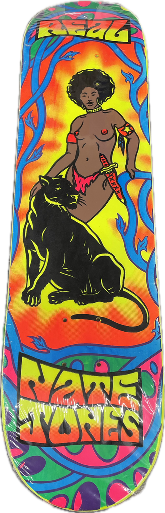 VITAGE REAL NATE JONES 7.75 BLACK LIGHT VELVET NEW STILL IN PLASTIC. This deck is one of the only ones we saved from the beginning of our store. We opened the same day the Medford Skate Park did in 2000. So this is probably one of the few decks saved for collectors we decided to keep from the start of our business.